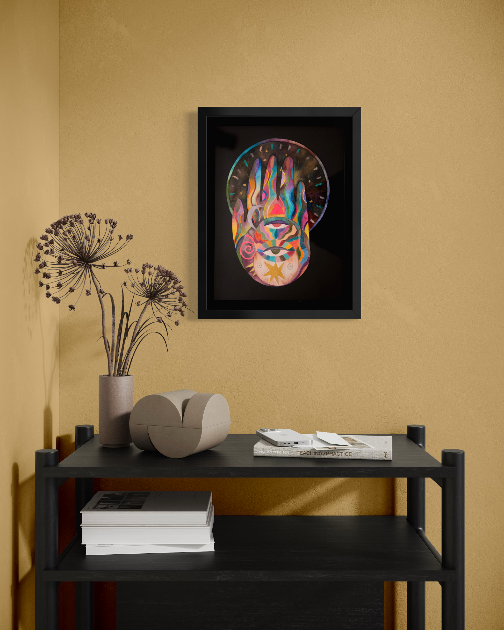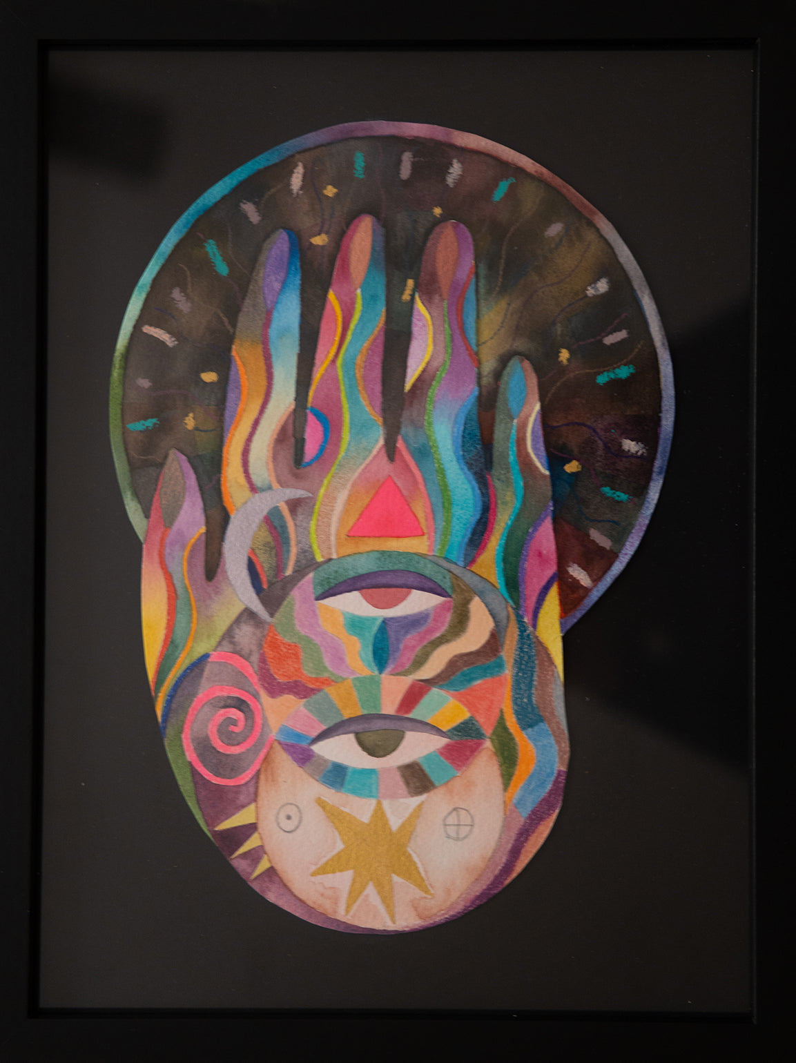 Obra de forma irregular montada sobre papel negro libre de ácidos.